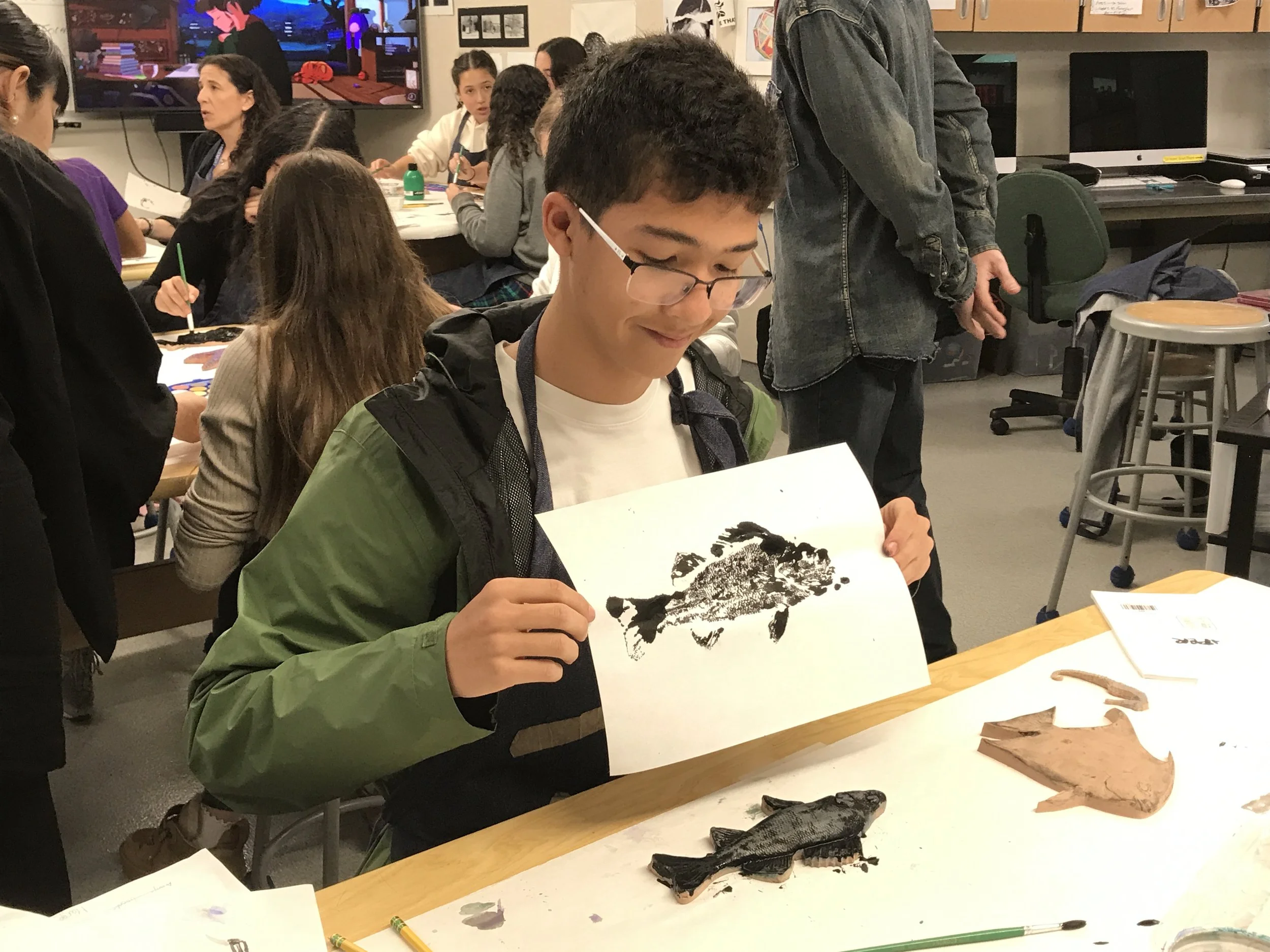 Tomorrow, Tuesday - 5/7/26, Blocks B and C, if you are free, please stop by the E-Building Photo Lab for a demonstration and studio activity of the ancient form of Gyotaku printmaking.